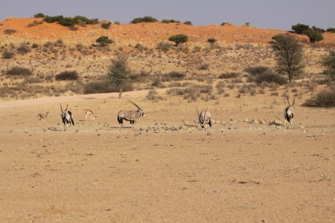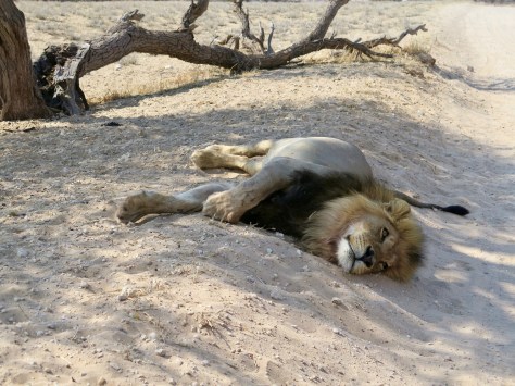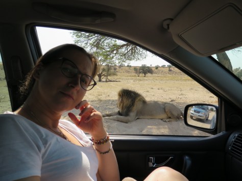Zakochałam się w Parku Kgalagadi. Jest to pustynny, gorący teren. Jechałam, jechałam, jechałam pustynną drogą pośrodku niczego i nagle… LEW!!! Piękny Lew Pustyni Kalahari. Szok, piach, upał pył i lew. Przepadłam. Ludzi, turystów jak na lekarstwo, w sklepie spożywczo, elektryczno, grillowym wybór tak albo nie 😀 Czyli moja dieta wegetariańsko – bezglutenowa wystawiona na ciężką próbę, ale było pięknie. W kampie jesz tak jak na żaglach z moim Tatą, jesz jak sobie ugotujesz 🙂 Ale było pięknie. Nie ma internetu, nie ma sygnału w telefonie, więc raczej organizm nie choruje 🙂 Już nie wspomnę, że o telewizji czy radiu to można zapomnieć jeszcze przed bramami parku. Było pięknie.