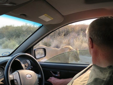 Nie ma moich ukochanych słoi w Parku Kgalagadi, ale są lwy i przepiękne Oryxy, o matko jakie one są piękne 🙂 Czy mówiłam, że nie ma za dużo ludzi przez co teren wydaje się bardziej dziki? Lwy też wydają się bardziej dzikie. Nawet Andrzej kozak w Afryce przestraszył się lwa idącego obok samochodu. 😀 Niby sobie obserwuje, ja robię zdjęcia, rozmawiamy, ale gdy lew był już na wysokości Andrzeja drzwi to sama mu ręka poleciała, żeby przymknąć okno 🙂 Widok bezcenny 😀 Ale żeby nie było ja węże oglądałam przy całkiem zamkniętych oknach 🙂 Wiadomo? Jeszcze się rzuci? 🙂